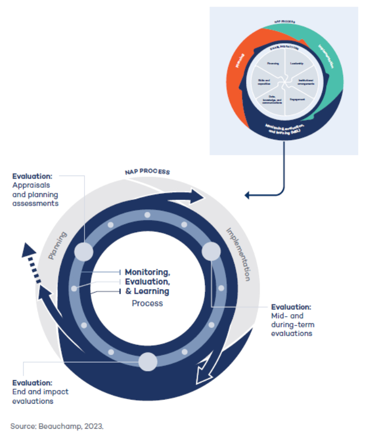 ຮູບທີ 2 ສະແດງໃຫ້ເຫັນວິທີການ MEL ເກີດຂຶ້ນຕະຫຼອດຂະບວນການ NAP. ການຕິດຕາມດໍາເນີນການໂດຍຜ່ານການເກັບກໍາຂໍ້ມູນຢ່າງຕໍ່ເນື່ອງແລະການວິເຄາະເພື່ອຕິດຕາມຄວາມຄືບຫນ້າຂອງຂະບວນການ NAP; ການປະເມີນຜົນເກີດຂຶ້ນຢູ່ໃນຈຸດຍຸດທະສາດຕະຫຼອດຂະບວນການ NAP; ແລະການຮຽນຮູ້ແມ່ນຂະບວນການຢ່າງຕໍ່ເນື່ອງຕະຫຼອດຮອບວຽນ MEL ທີ່ແຈ້ງໃຫ້ຮູ້ການວາງແຜນ ແລະການປະຕິບັດ.